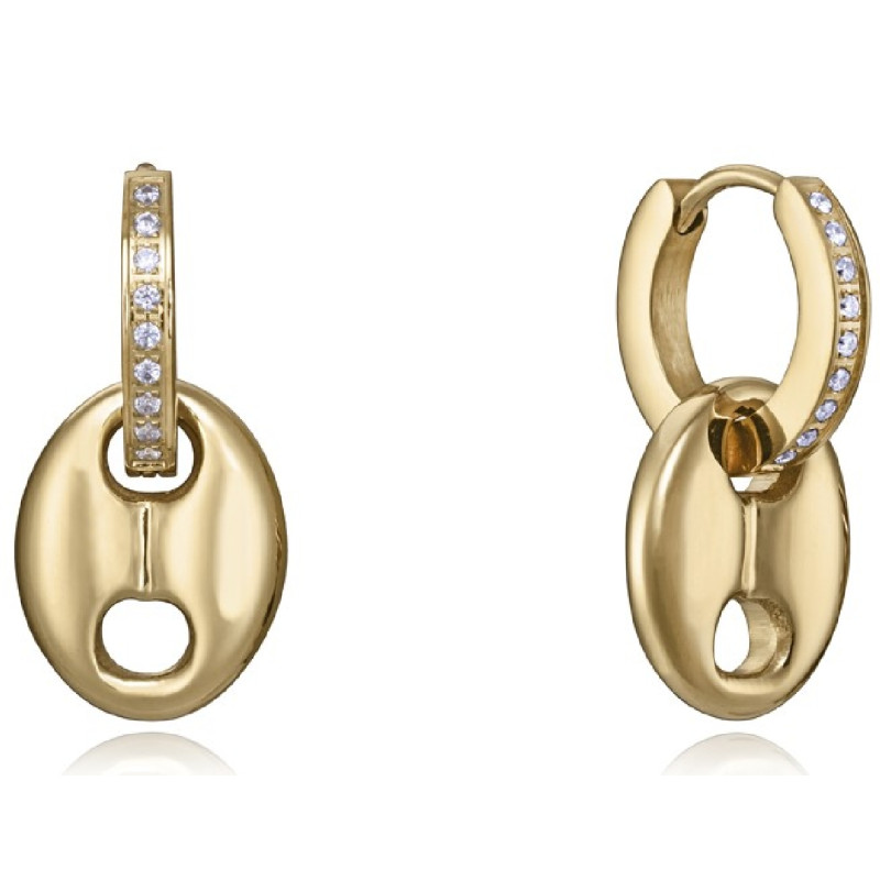 Hermosos pendientes de acero dorado y circonitas con colgante en forma de eslabón y 2 cm de largo. El colofón a un look de lo más potente y elegante, vístete con estas dos joyas en esas citas importantes que nunca vas a olvidar. Vive el día arropada con unos complementos únicos. Los encontrarás en exclusiva en la colección de Viceroy.
