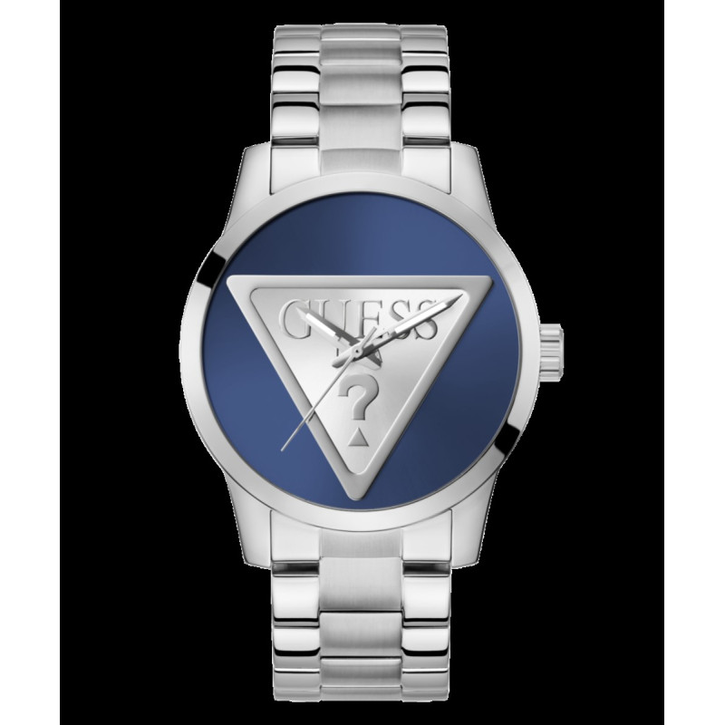 Reloj de acero para hombre de la marca Guess. Reloj de acero plateado con esfera azul con el mítico triángulo de la marca en plateado. Un básico para elevar cualquier llok y darle un punto de modernidad.