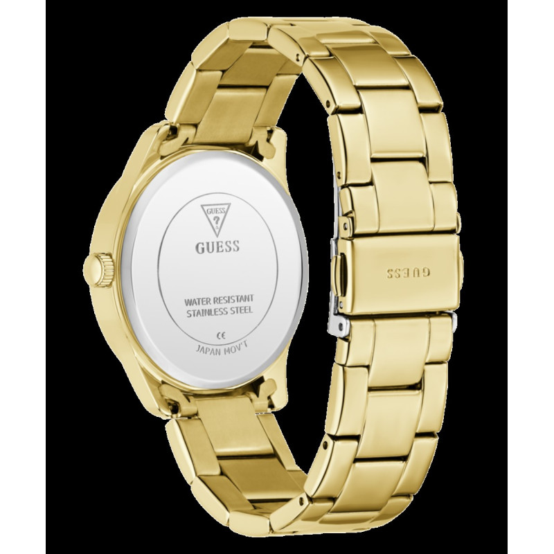 Reloj de mujer de la marca Guess con caja de acero reciclado brillante de 36 mm dorado con cristales y pedrería, esfera con logotipo 4G con superposición del logotipo del icónico triángulo y brazalete de acero brillante dorado. Un modelo icónico que destaca por su esfera con doble logotipo, un diseño moderno y sofisticado que brilla con identidad propia.