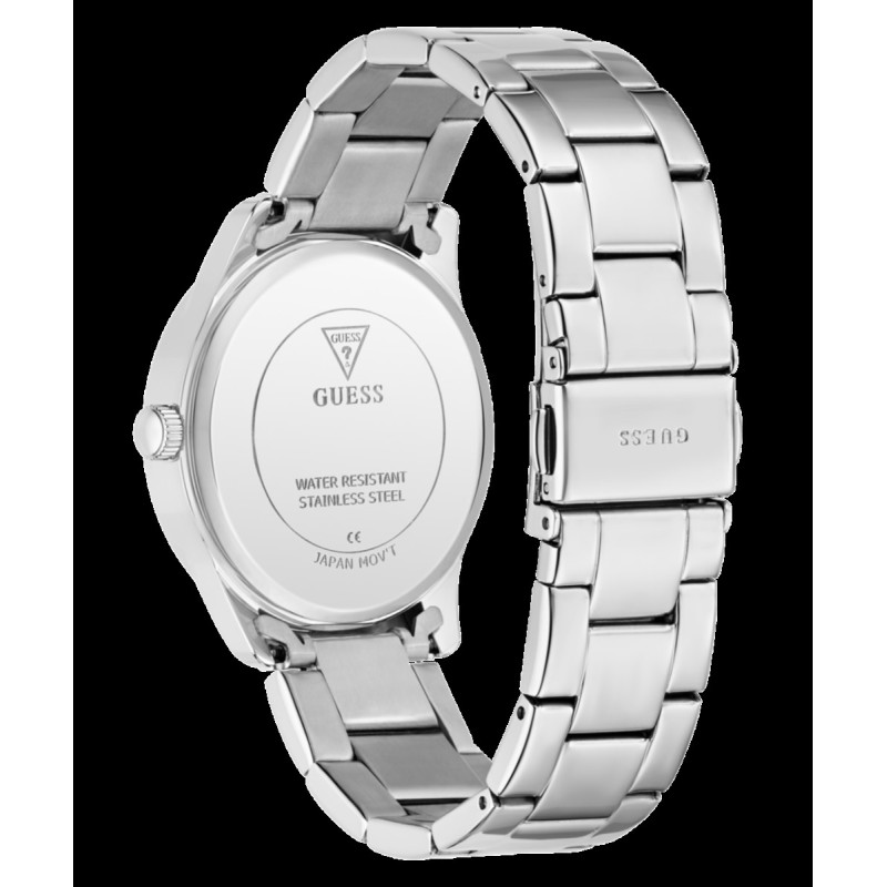 Reloj de mujer de la marca Guess con caja de acero reciclado brillante de 36 mm plateado con cristales y pedrería, esfera con logotipo 4G con superposición del logotipo del icónico triángulo y brazalete de acero brillante plateado. Un modelo icónico que destaca por su esfera con doble logotipo, un diseño moderno y sofisticado que brilla con identidad propia.