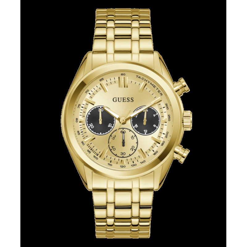 Reloj de hombre Guess con caja de acero reciclado brillante dorado de 44 mm, esfera multifunción de iridiscente dorada con pulsadores, brazalete de acero inoxidable brillante dorado. Un diseño moderno con aire sofisticado, ideal para quienes buscan un estilo pulido con carácter.