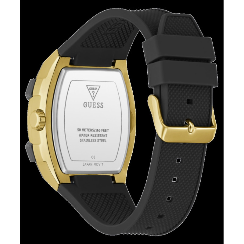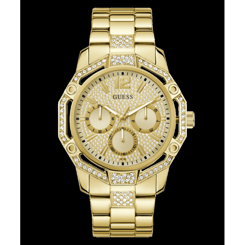 Reloj de hombre Guess con caja de acero reciclado brillante de 46 mm dorada con recorte y detalle de cristal, esfera multifunción dorada de iridiscente con polvo brillante y brazalete dorado de acero brillante con eslabones de cristal. Un reloj robusto y sofisticado que aporta un toque de realeza a cualquier estilo, ideal para destacar con personalidad única.