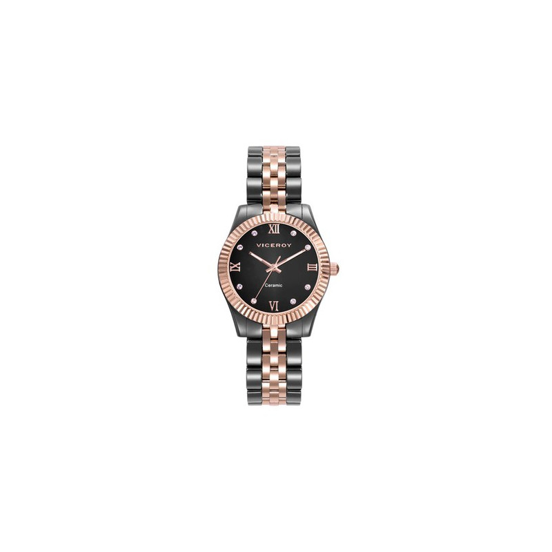 Reloj para mujer con caja y brazalete de cerámica negra y acero rosa. Esfera también negra con índices de circonitas. Si quieres vestir sofisticada al tiempo que te distingues de las demás, estás de suerte, has encontrado tu complemento perfecto. Lúcelo, lúcete.
