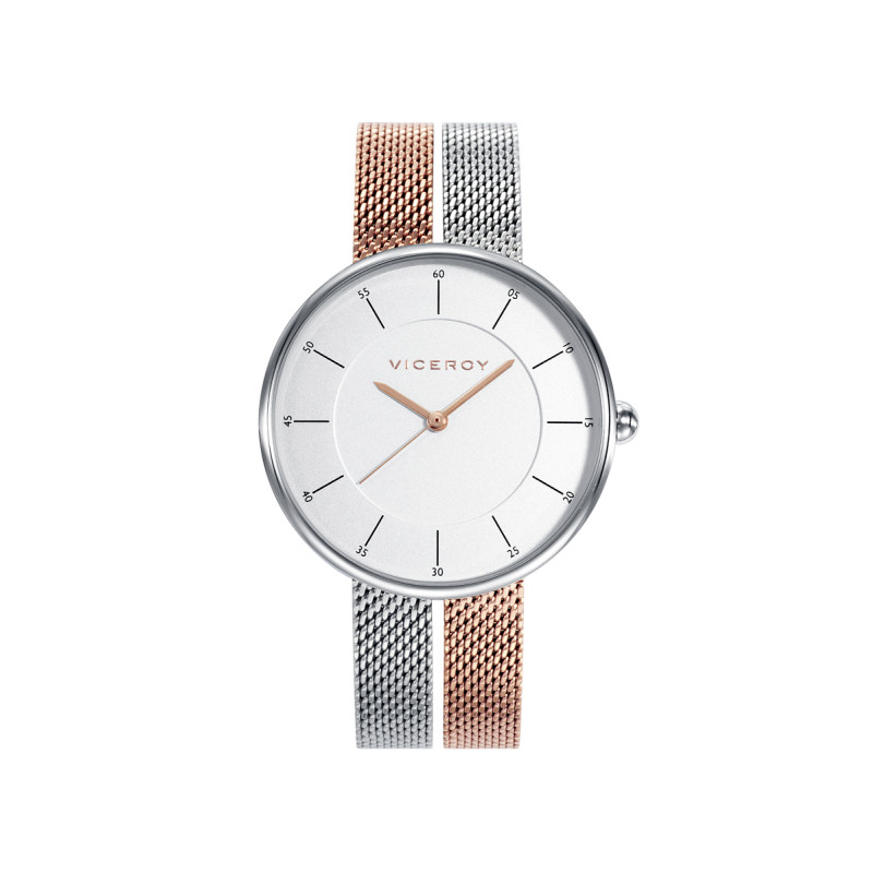 Reloj de Mujer Viceroy Air 42374-17 tres agujas con caja de acero y una doble malla milanesa bicolor con IP rosa. Esfera blanca, índices en plateado y segunderos rosados.